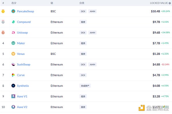 DeFi項目鎖定資產前十排名及鎖倉量,數據來源:Debank