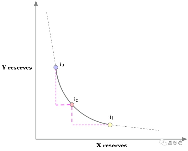 因為當前價格遠低于il,即使從當前價格向iu滑動,也只需要x的資金,不需要y的資金。所以,在這種情況下,delta_Y = 0。因為從il滑向iu需要整個區間的x的資金,對于delta_X來說,價格變化為1/sqrt(il) - 1/sqrt(p(iu))。