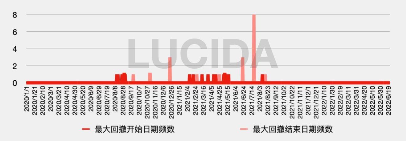 下面紅色的圖是21條公鏈最大回撤的時間分布情況;絕大部分公鏈在2021年2月-5月發生最大回撤,并在2021年6月-8月企穩反彈,平均回撤周期為69天,平均回撤幅度為59.9%。