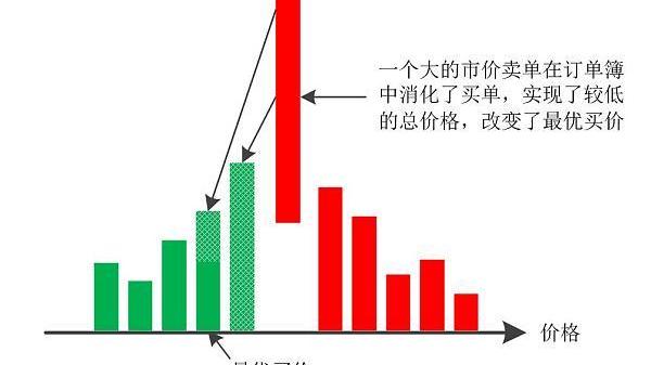 當市價買單到達時,從放置的最優賣價開始,與限價賣單撮合匹配。如果到達市價買單的大小大于最優賣單隊列的大小,市場買賣盤的“掃光”是通過其他賣單隊列的方向提高價格,在這些價格分筆上“吃掉”可獲得的流動性。“掃光”過后,在賣方的限價訂單處有一個明顯的缺口,瞬間增加了買賣價差,并可能誘發隨后的市場買單下移。市價賣單同理。