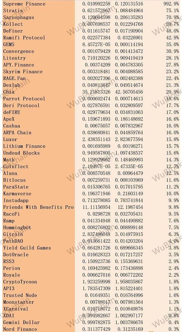 最后,我們對2020年7月以來所有有過公開融資記錄的項目在本月的價格表現進行了簡單的統計。共計2811輪次,包含615個Token。