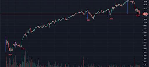 數字資產的縮水是殘酷而痛苦的。但是Arca的高級交易員RenzoAnfossi注意到了其他歷史上的大幅下跌,尤其是FAANG的股票。這是一個很好的復習,了解這種規模的回撤是多么普遍,以及在恢復的道路上可以有多么劇烈。以下是Facebook、Netflix和亞馬遜的一些最大虧損。請注意,它們看起來與數字資產非常相似。?