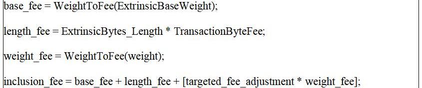 base_fee、weight_fee和length_fee構成inclusionfee(包含費用)。inclusionfee(包含費用)是交易被包含在一個區塊中必須可用的最低費用。