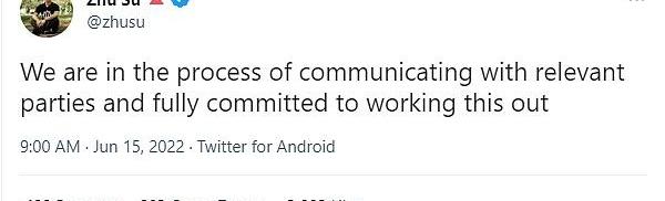 6月15日,三箭資本創始人ZhuSu發推稱,我們正在與有關方面進行溝通,并致力于將問題解決。