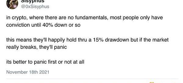 @0xsisyphus的這條推文完美的反映了這一點。你對自己的態度越真誠越好。不要持有讓你感到不舒服或者恐懼的資產。如果有必要的話,請繼續留在這里。如果你最終選擇投降,我認為你應該盡快這樣做,賣掉你覺得不再持有的東西并不是一件可恥的事兒。