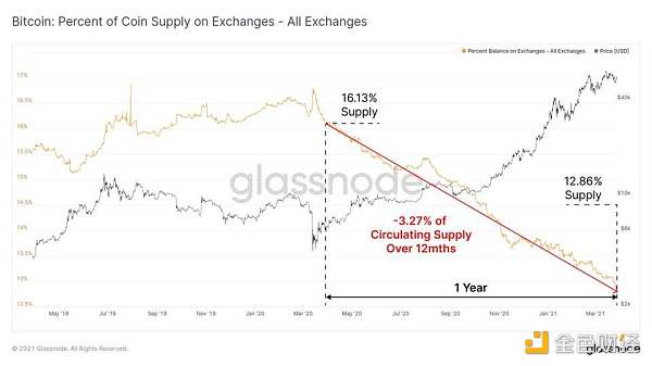 隨著越來越多的幣種積累并轉移到長期存儲中,交易所余額一直處于持續下降趨勢,這已經不是什么秘密。僅在過去的 12 個月里,就有超過 3.27% 的流通 BTC 供應量遷移出交易所,進入第三部分錢包。
