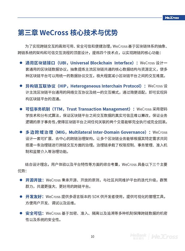 基于此設計理念,WeCross創新性提出UBI通用區塊鏈接口、HIP異構鏈互聯協議、TTM可信事務機制、MIG多 邊 跨 域 治 理四個核心技術,實現了跨鏈交互的高效可用、安全可信和便捷治理。