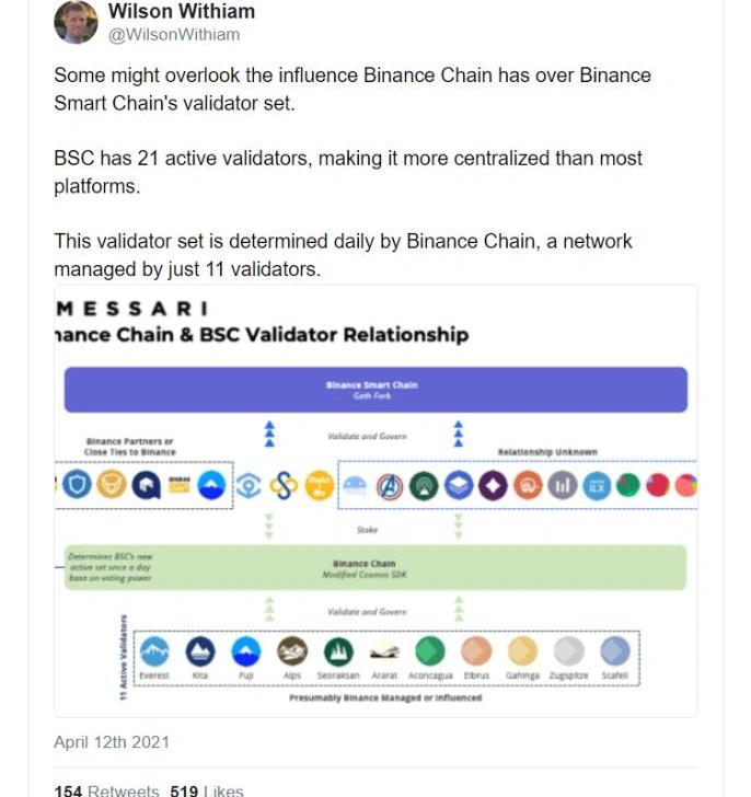 以第三大區塊鏈BinanceSmartChain為例,其驗證者網絡總共有21個驗證者,與比特幣和以太坊等區塊鏈的數萬和數十萬驗證者節點相比,非常少。
