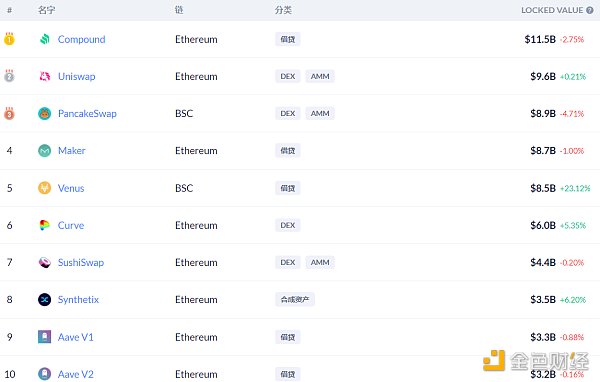 DeFi項目鎖定資產前十排名及鎖倉量,數據來源:Debank