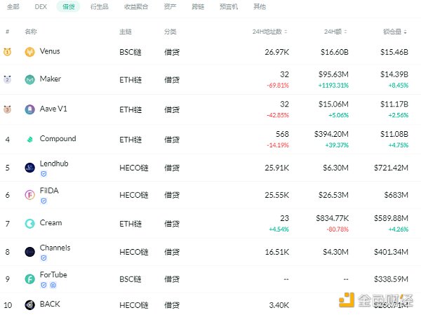 鎖倉量排名前十的借貸平臺 排名來源:DeFibox