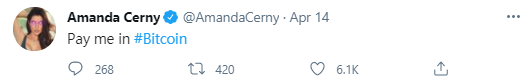4月14日,美國喜劇演員Amanda Cerny宣布接受BTC支付美國網紅、喜劇演員、模特Amanda Cerny在推特宣布,接受BTC支付。