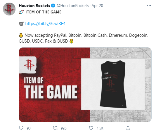 休斯頓火箭隊官方宣布,其官方商店已支持Paypal、BTC,BCH、ETH、狗狗幣以及美元穩定幣等加密貨幣支付。 此前消息,NBA火箭隊老板旗下餐飲品牌也將接受BTC等加密貨幣付款。