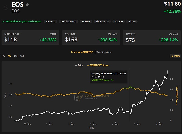 如上圖所示,EOS的VORTECS?得分在5月的前幾天處于黃色范圍,然后在5月4日進入綠色區域,獲得了68的高分。就在一小時后,EOS的價格開始在接下來的兩天里上漲100%。