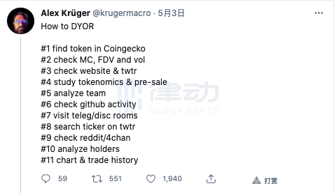 最近,我刷到了交易員 Alex Krüge 發布的一條推文,其中就寫到了他列出來的一份關于在涉及 DeFi 代幣時如何 DYOR 的操作流程,具體如下: