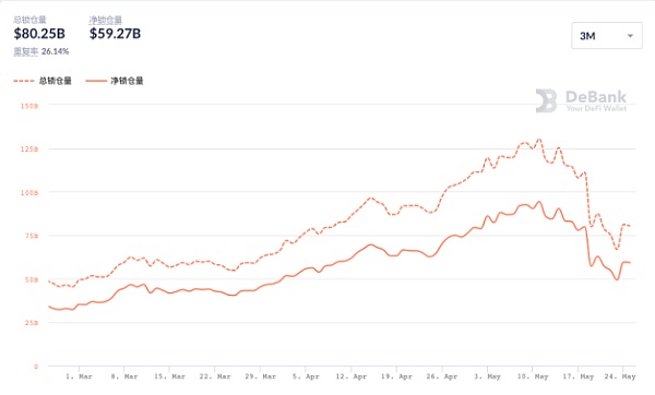 其他被清算的DeFi玩家就沒那么幸運了。DeBank數據顯示,5月19日當天,鏈上清算資金達到6.14億美元,創造了歷史新高。要知道,在一年前,整個DeFi生態的TVL才不過8.13億美元。