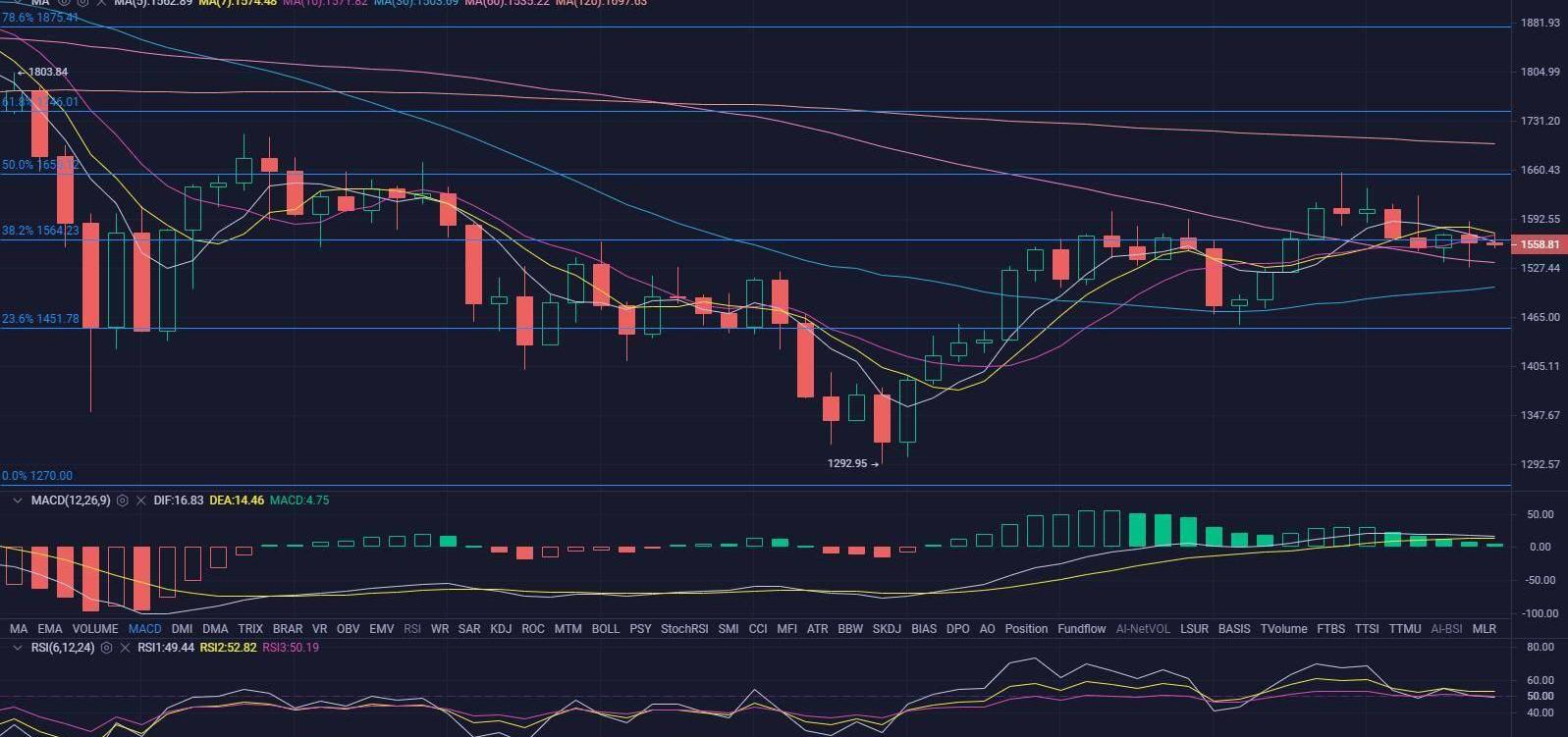 以太坊今天最高反彈1624美元后遇阻回落,目前在1550美元附近震蕩調整。現在來看4小時線MACD即將下穿零軸,KDJ指標三線下行,布林帶收縮運行在中軌,RSI指標走平,運行在在中線,整體來看當下仍有下調空間。從大的周期上面ETH在4月份也有升級利好,是可以期待的。壓力位:1655美元,支撐位:1500美元。,是值得期待的。操作建議:中長線持有。