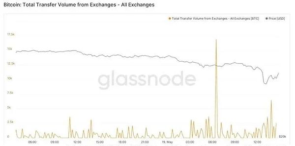 大量杠桿交易被清算過后,Glassnode數據顯示一些巨鯨在利用這個機會抄底,他們迅速將新獲得的比特幣放入個人錢包,5月19日凌晨6點多10分鐘內流出的16895 枚比特幣就是證明。