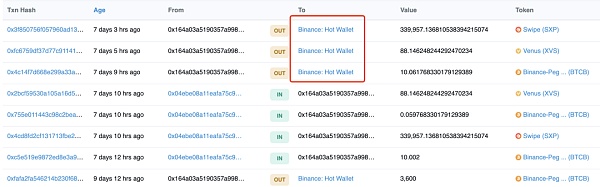 Cannon 錢包、已清算的XVS錢包和Venus/Swipe團隊的財務錢包都直接鏈接到同一個Binance交易所的存款地址上。