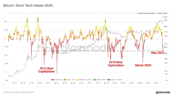 如果我們通過 STH(幣齡 < 5 個月大)過濾這個指標,我們可以看到 5 月的拋售在規模上與熊市和比特幣歷史上最大的投降相匹敵。?