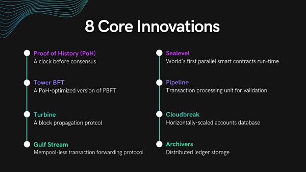 最初創建Solana的初衷是,希望去中心化的節點網絡可以匹配單個節點的性能,但前提是必須對網絡中節點之間的通信進行適當優化,沒有其他區塊鏈能接近實現這一屬性,因此實現這一目標是Solana的最終目標。為了創建與單個節點的性能相匹配的去中心化、無許可的網絡,Solana團隊就潛心研究,開發了8項關鍵創新技術。