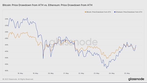 放大來看,ETH/BTC在下跌過程中表現出彈性。在以前的危機中,風險通常從ETH逃到BTC,ETH經歷的跌幅明顯更大。這一次,情況發生了變化,ETH仍然比BTC的β值高,但差距不大。由于ETH與BTC相比顯示出對市場下跌的彈性,DeFi參與者有可能逃向ETH作為力量而不是BTC和穩定幣。