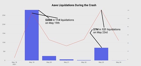 借貸協議已經體現出來了,價值鎖定保持強勁,清算保持在最低水平。在市場崩潰期間,穩定幣抵押品的損失是借款人的一個關鍵風險。隨著價格越來越不穩定,抵押品的要求也更難滿足。此外,不穩定的抵押品、清算和不同的利用水平會造成利率的波動。波動的利率會導致借款人進一步提款。幸運的是,穩定幣保持健康,利用率保持健康,借貸市場總體上在高波動期間表現得如意。在崩盤過程中,415名借款人在Aave上面臨清算事件,清算金額僅為3840萬美元