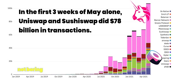 包括 Uniswap 等去中心化交易所 (DEXs) 的交易量增長了 76 倍,從 2020 年第一季度的 23 億美元增至 2021 年第一季度的 1770 億美元;