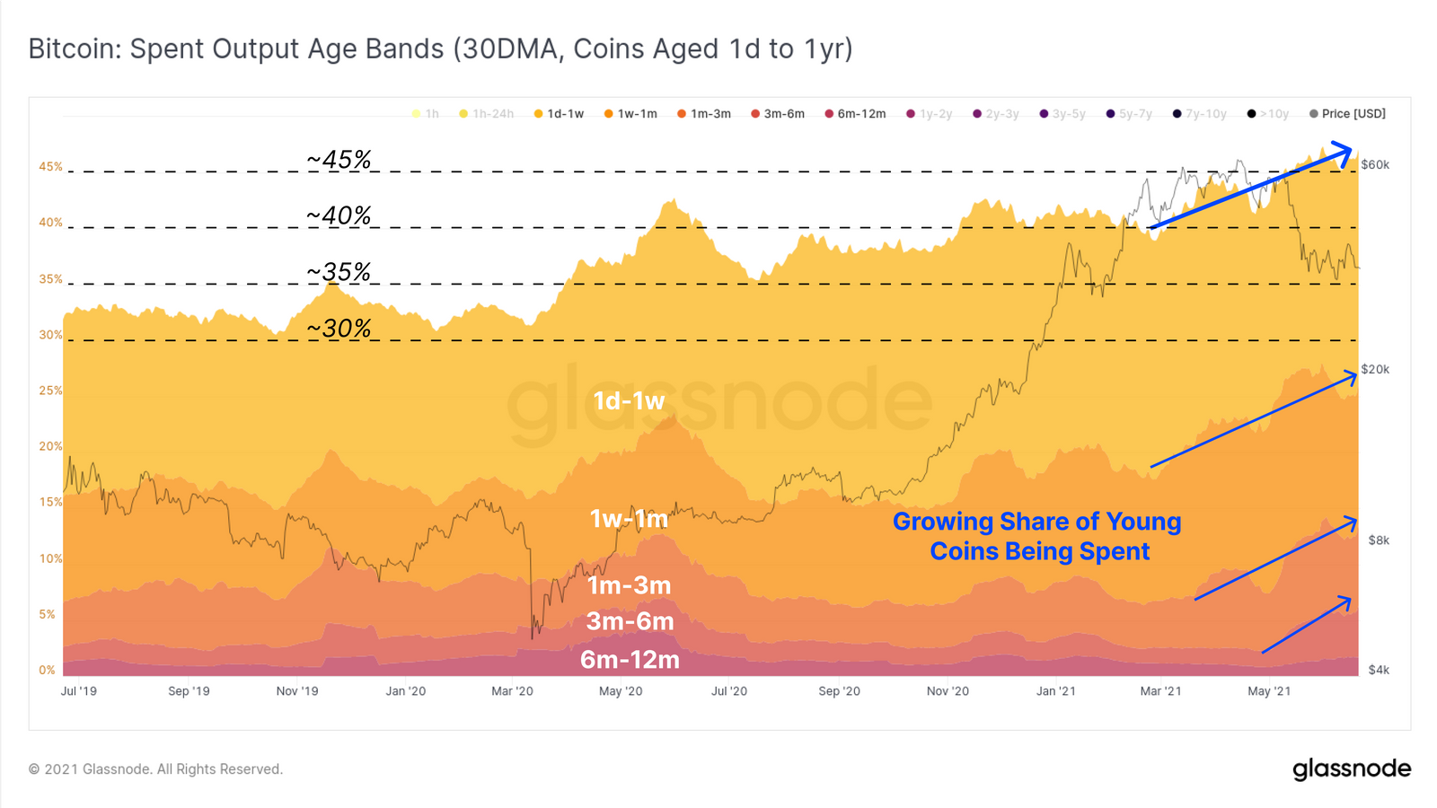 該報告寫道,如果我們調查過去一年的總支出行為,我們會看到年輕代幣所占的比例在交易流中所占的比例繼續增加。在過去的幾個月里,我們看到年輕代幣占總交易量的45%以上。