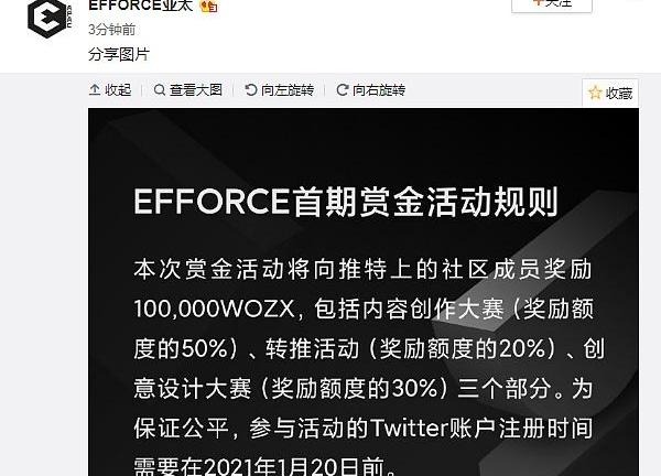 內容創作大賽:根據Efforce的內容質量和后續參與情況,我們將給予獎勵。評論數>200,200個WOZX,評論>50,100個WOZX,評論>20,50個WOZX。