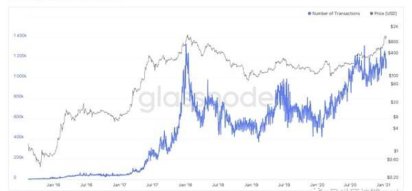 據glassnode數據顯示,ETH近期交易量已逼近2018年幣價峰值水平。與2018年交易量的暴增暴跌不同,本輪行情ETH交易量整體維持在高位震蕩,這顯示了投資者對ETH的投資熱情不是沖動性的,大有在蓄力的感覺,相信ETH突破前高不會是本輪行情的終點。