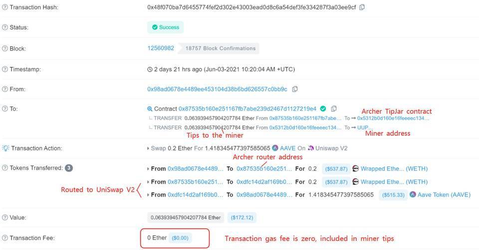 我花了 0.2 WETH 交換到 1.418 AAVE。流程是,首先將 0.2 WETH 轉入 Archer Router 地址,然后將 0.0639 ETH 從這一地址轉入 ArcherSwap TipJar 合約,支付給礦工(UU 礦池)作為小費。然后將 Archer Router 地址路由到 Uniswap。