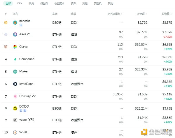 DeFi項目鎖定資產前十排名及鎖倉量,數據來源:Debank