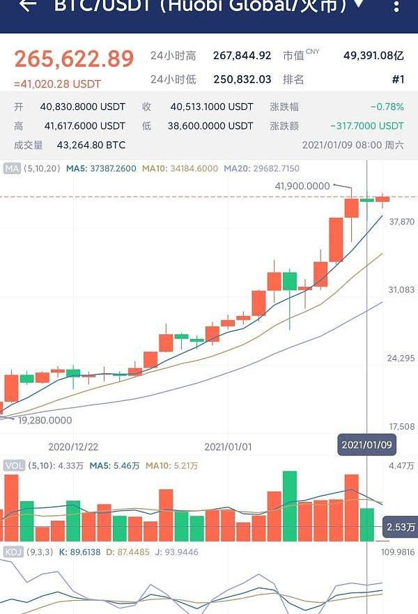 2021年1月9日比特幣跌幅0.78%,收盤價40,513.1美元。1月10日的價格運行于三條均線之上。