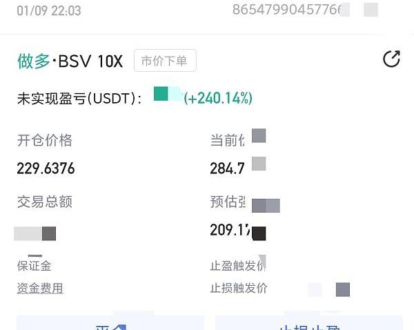經過一番考慮以后,我決定介入其中。1月9日22:03做多BSV,開倉價格229.6376美元,杠桿倍數為10倍。