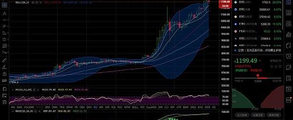???以太價格再度上攻,刷新年度新高,高位觸及1208位置,價格承壓下行90余點,低位觸及1115位置止跌隨后反彈,上行至1201位置后承壓回落,目前價格運行在1186附近