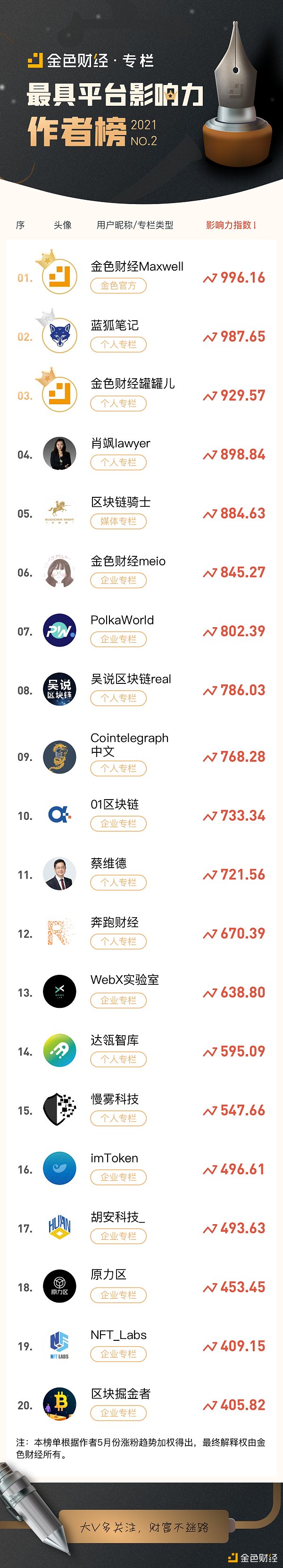 自2021年5月起,金色財經推出了「金色財經最具平臺影響力作者榜」,用以激勵高質量、高流量、高粉絲粘性的Top20專欄作者。榜單依據作者當月月份漲粉數據、過往發文質量、傳播數據、更新頻次等數據加權得出。