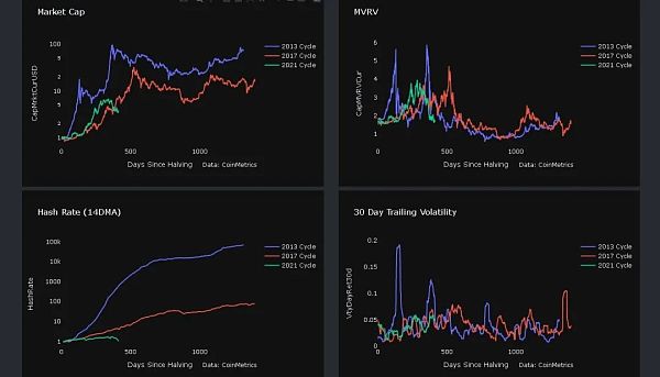 Coinmetrics表示,比特幣的供應量每四年減少50%。到目前為止,已經有三次這樣的減半,最近一次是在2020年5月11日。每一次減半都有效地預示著一個新周期的開始,2013 年周期在第一個減半后 370 天達到峰值,2017 年第二次減半之后524天達到峰值。第三次減半已經過去413天了。