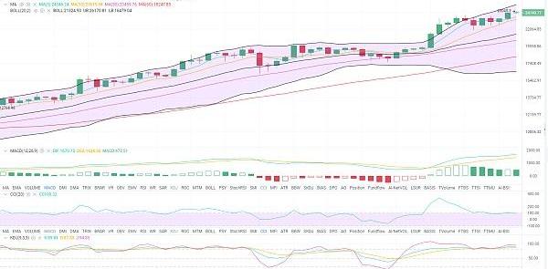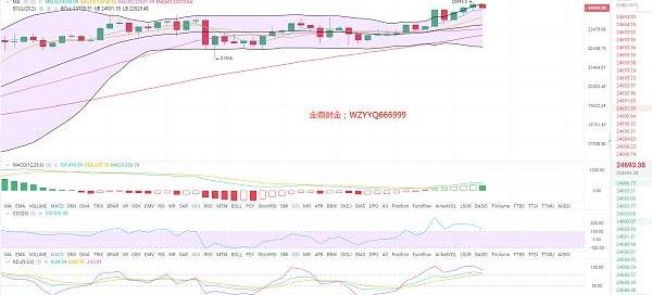 昨日K線收陽,行情在晚間過后行情從低位逐漸收回到了開盤價的上方波動,并向上最高觸碰到了24682點位,收盤也在24000上方,為今日打下了堅實的基礎;當前行情企穩在五日均線和十日均線上方波動,不斷的向上展開攻勢,截止此時此刻行情最高向上觸碰到25000點位,并有繼續向上沖刺的趨勢。