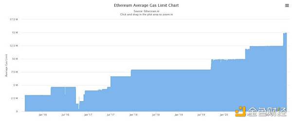 然而,只要礦池愿意他們可以通過協作去提高 Gas Limit。你從這張歷史 Gas Limit 變化圖可以看到礦池們不是完全單獨地去決定最佳的以太坊區塊大小,他們更像是一個聯盟,私下討論最佳的區塊大小并進行一致投票(如圖所示突然上升的 Gas Limit)。