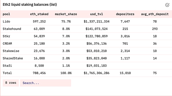 通過 duneanalytics 提供的統計數據(上圖)可以看到,目前通過提供流動性的質押池服務商(pool)質押的 ETH 數量為 78 萬+,占到了 Eth2 質押總量(目前大概為 600 萬 ETH 左右)的 12.54%。