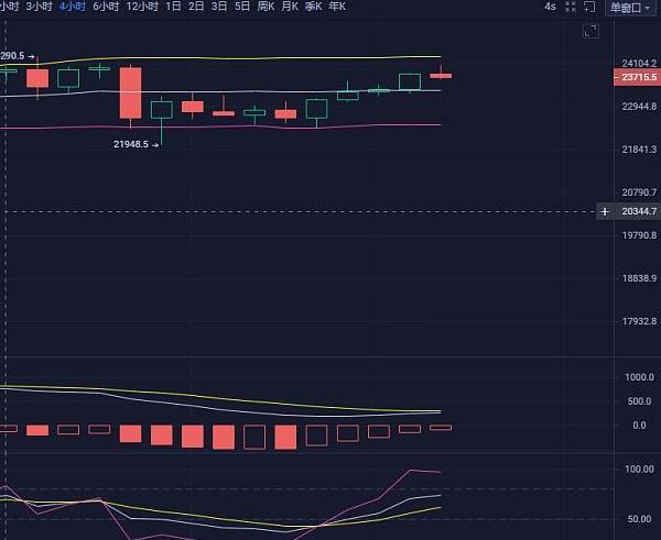 ??行情分析:四小時級別圖中,布林帶上方微微開口,現位于23700:行情承壓并未跌中規支撐,目前也是如預期回踩走出反彈,后續只要回落保持23200一線上方,多頭情緒勢必再度升溫,行情進一步上行將有機會觸及24100一線位置。附圖中,MACD快慢線在零軸上方運行,呈向上放量姿態;RSI和Stoch均保持著平緩的姿態運行著;白盤目前操作先來一波空單再做回踩