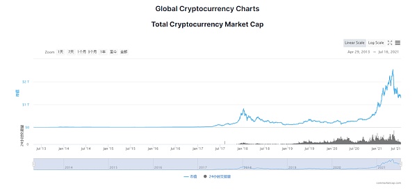 以太坊上,加密貨幣種類的噴發進一步推動了加密貨幣總市值的增長。根據Coinmarketcap數據顯示:2018年1月,加密貨幣總市值達到了頂峰約為7200億美元,以太坊上ERC-20代.幣的爆發貢獻了大部分數據,時至2020年年底加密貨幣總市值才再次突破前高。