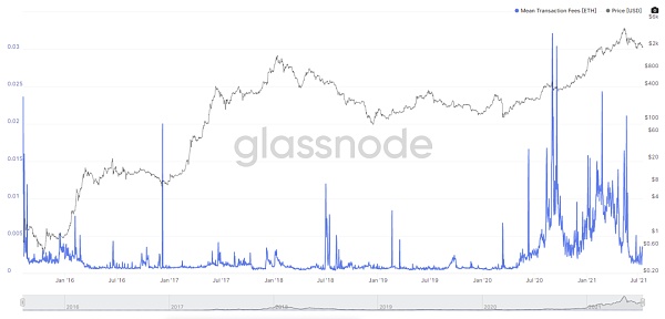 2018年的7月,伴隨著市場整體的降溫以及CryptoKitties的熱度下降,市場整體交易量有所回落,但是單筆交易平均消耗Gas始終居高不下,峰值達到了0.007ETH,按照當時ETH價格474美金,單筆交易消耗GAS費成為約為3.3美金,當時是對于很多投資者來說是不能接受的。不過這與2020年DeFi爆發后的GAS費水平相比,真的是小巫見大巫。