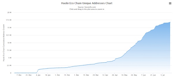 Heco上地址增速以及總量亞于BSC,整體也在保持一個高度的增長,目前賬戶地址總數為1678.8萬個,去除存在一用戶注冊多地址的情況下,地址數的驟增也完全能夠反應短時間用戶增量的情況。