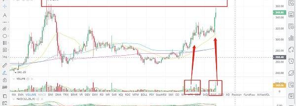 在此時行情并沒有超過前高,而且成交量并不是特別的多,說明真正的主力其實還沒有發力,所以已經錯過了的小伙伴,也沒有什么好可惜的,但千萬不要盲目的去追,否則容易被套。如果接下來的行情沒有大量的成交量支撐的話,那么可以判定行情將在4小時級別MACD上發生頂背離。下方支撐區域285,上方阻力區域371.9。