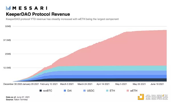 上圖:KeeperDAO 協議中的各個流動性池中的資金總價值 (單位:百萬美元),數據截至2021年6月27日。
