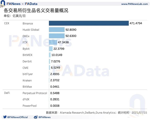 反觀DeFi衍生品協議的交易量,從DeBank和Dune Analytics收錄的為數不多的三個協議的交易量來看,DeFi衍生品的交易量遠遠小于CEX衍生品。按照7月13日的數據,期貨協議Perpetual Protocol和dYdX的交易量約為5488.30萬美元和2830.88萬美元,指數協議PowerPool的交易量約為8.30萬美元,合計尚不足1億美元。如果按照三個協議的平均交易量來估算,那么當天觀察范圍內的21個DeFi衍生品協議的總交易量大約為5.83億美元,仍然遠低于CEX衍生品的單日總交易量。