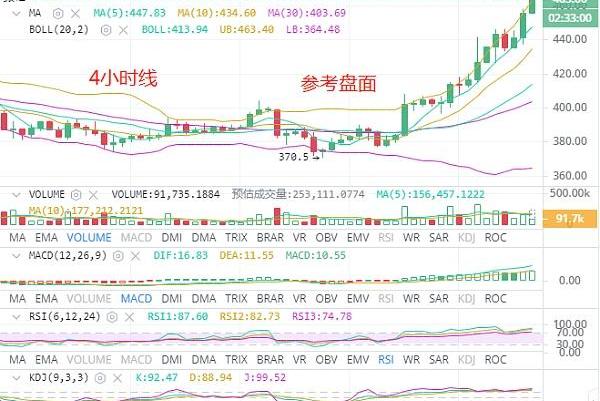 以太坊近兩日,領漲主流幣,波幅達30-40余點。今日開盤以來,450壓制位失守后,現已強勢上沖至464一線,目前日線布林帶上軌已被強勢企穩,大有直奔周線布林帶上軌而去的意思。四小時線來看,幣價沿布林上軌震蕩運行,布林帶開口向上,MA5在K線下方形成有效支撐,多次試探均未有效突破,技術上來看,多頭勢能均衡放量,快慢線在零軸上方運行,RSI三線排列運行,今日上方壓制位關注周線布林帶上軌476-477附近,下方支撐先關注四小時450位置。