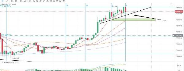 BTC行情分析 四小時圖來看,昨日早間大餅受到面影響,來了一波走跌,在試探13000位置遇到支撐,也就是布林下軌,空頭能量釋放完畢,行情開始回暖,K線5連陽拉升,突破重重阻力.