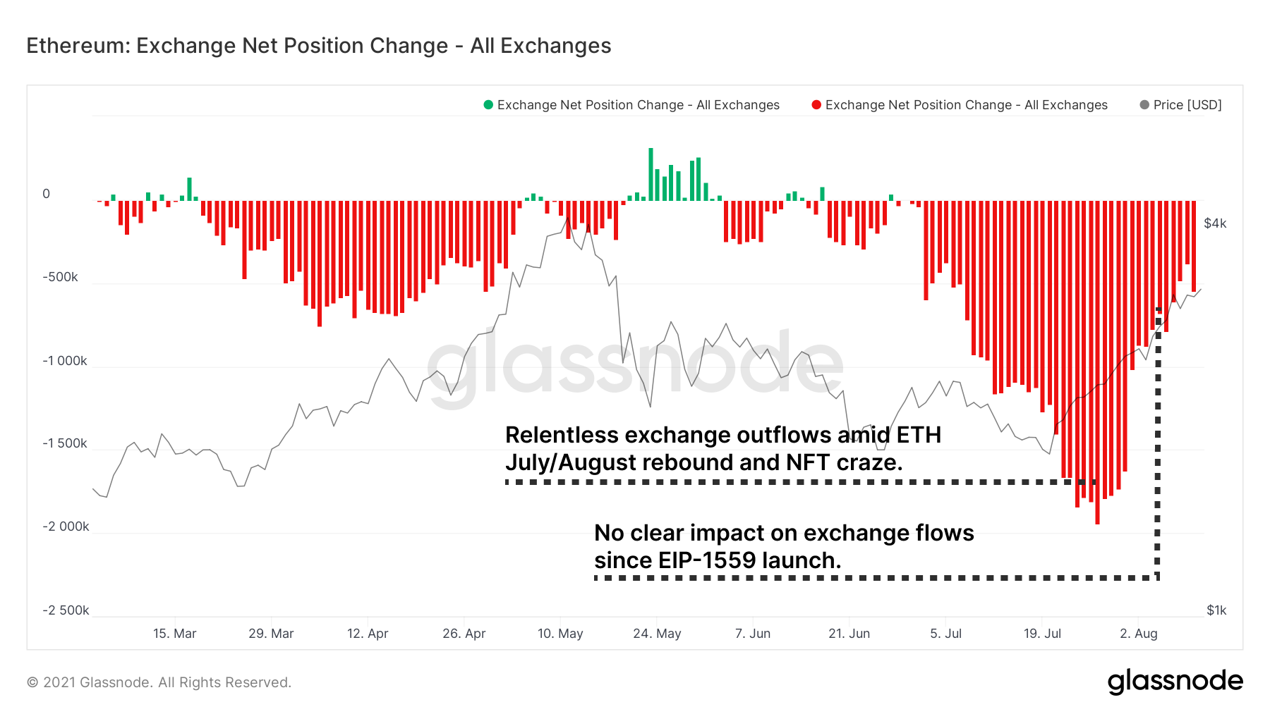 一個有趣的注意事項是交易所的凈頭寸變化指標。它顯示整個 7 月發生了相當大的資金外流,ETH 價格當時在 2,000 美元左右。外流在相對規模上有所放緩,但與歷史標準相比仍然較高。在 EIP1559 之后,尚未對交易流產生顯著影響,但這是一個值得關注的指標。